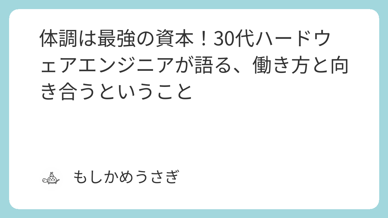 新卒で社会に出てから、がむしゃらに働いてきた人も多いのではないでしょうか。僕も気づけば30代。ハードウェアエンジニアとして、日々設計や検証に追われる毎日です。20代の頃は毎日夜遅くまで仕事をしていたこともありました。でも、ある時ふと立ち止まって考えたんです。この働き方、本当に持続可能なんだろうかって。僕たちが会社で働く上で、最も大切にすべきものは何だろう。その答えはとてもシンプルでした。それは、自分の体調です。
